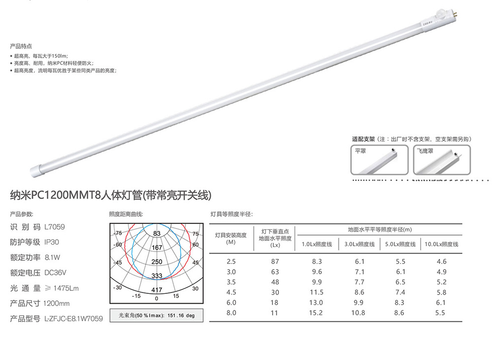 纳米PC1200MMT8人体灯管(带常亮开关线)